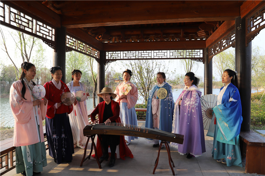 在一處涼亭中,一群身著漢服的女士正在彈唱《枉凝眉》。古箏聲典雅悠揚,彈奏者和伴唱者皆充滿古意,她們都是東籬漢服社的成員?!拔覀兪亲园l成立的民間組織,主要是因為熱愛,想傳播淮北的古箏、古琴、太極、朗誦、舞蹈、古詩詞、茶道等傳統文化,現在已經有240多人?!鄙玳L華虹介紹道。此時,另一邊的一群成員正在打太極。