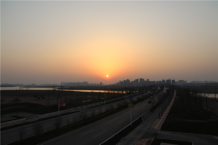 站在約4層樓高的觀景樓上,中湖景區盡收眼底。觀景樓橫跨一條寬闊的主路,路兩邊是明亮的路燈,據說這便是在社交平臺上非?;鸬木W紅馬路。中湖景區即綠金中央公園,其中的“綠金”便來源于“綠水青山就是金山銀山”。其治理前為朱莊-楊莊礦因采煤而造成的塌陷區,規劃面積約1400公頃,按照國家4A級景區建設,按照城市宜居中心、景觀核心、生態綠心、濕地核心的定位,將景區打造為集生態保護修復、旅游休閑度假、歷史文化深厚為一體的高標準城市中央公園。