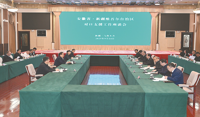 九月十四日下午,安徽·新疆對口支援工作座談會在烏魯木齊召開。記者 楊竹 攝 (宗禾 李浩)9月13日至14日,省委書記梁言順率安徽省黨政代表團赴新疆維吾爾自治區考察,深入學習貫徹習近平總書記關于新疆工作的重要講話重要指示精神...