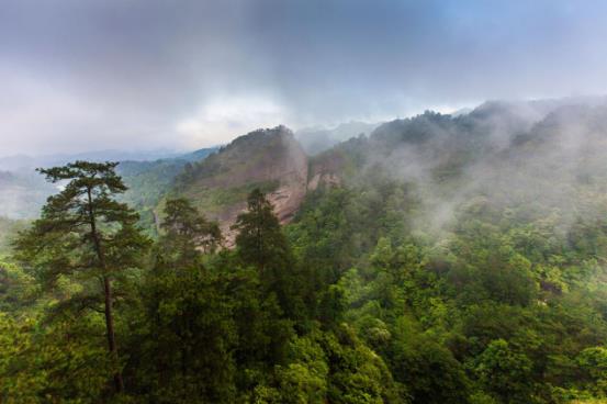 松樹奇特、植被茂密是萬佛山的另一特色。山中奇松多,與黃山諸奇松麗質相同,有的品味極高。如“二仙迎客松”長臂輕舒、熱情奔放;“盤龍松”游龍凌空、虬勁剛毅;“臥龍松”屈曲有致、蓄勢待發;“華蓋松”峨冠翠蓋、威嚴氣派;“天門松”頂天立地、巍然雄踞;“依仗松”英武矯健、威風凜凜;“荷葉松”亭亭玉立、風姿卓約;“栲栳松”錚錚鐵骨、歷盡滄桑。這些奇松均生長于海拔1000米以上的峰之巔、壑之旁、絕壁峭石之間,極富個性,內含氣質,令人流連往返。入空山深林,走九龍棧道,環顧山林翠綠,鳴蟬不歇。這里不時會遇見珍稀樹種黃連木、鵝掌楸、銀鵲樹、黃山花楸、豹皮樟、山拐棗等,且樹齡大都有百余年,樹皮苔衣泛鉛白色,盡顯歲月滄桑。因處于北亞熱帶,萬佛山森林覆蓋率高達95%,負氧離子含量高,適宜盛夏避暑。優良的生態環境孕育了豐富的動植物資源,有25種國家保護植物,10余種國家保護的香獐、金錢豹、娃娃魚等動物,構成了一個天然的動植物園。在徐大坪瀑布與咚咚嶺之間峭壁上,生有兩棵緊倚的松樹,松枝斜欹,仙風道骨,它們與黃山松屬同種,樹齡約250年,樹冠多為扁平狀。兩松如姐妹、如情侶,立懸崖之上,歡迎游客到來。因兩古松酷似黃山迎客松,因而得名“二仙迎客松”。過了“咚咚嶺”,有一段棧道建于懸崖之上,那就是“關刀口”,行于其上,險況環生,過了這段險路,便有一棵蟠龍老松立于山崖。這棵約260年的老松曾遭雷擊蟲蛀,樹干縱向裂開,仍青蔥繁茂,如一頂華蓋,吸納萬佛山的云霧,扎根在貧瘠的巖縫中。眺望四周,一路上美景無限,攀獨巖峭壁,登丹峰極頂,看野草豐茂,觀百花盛開,聽松濤陣陣,聞小鳥啼唱,呼吸著帶有陣陣樟香味的清新空氣,神怡之感,殊為難得,完全忘記了登山時的疲勞。