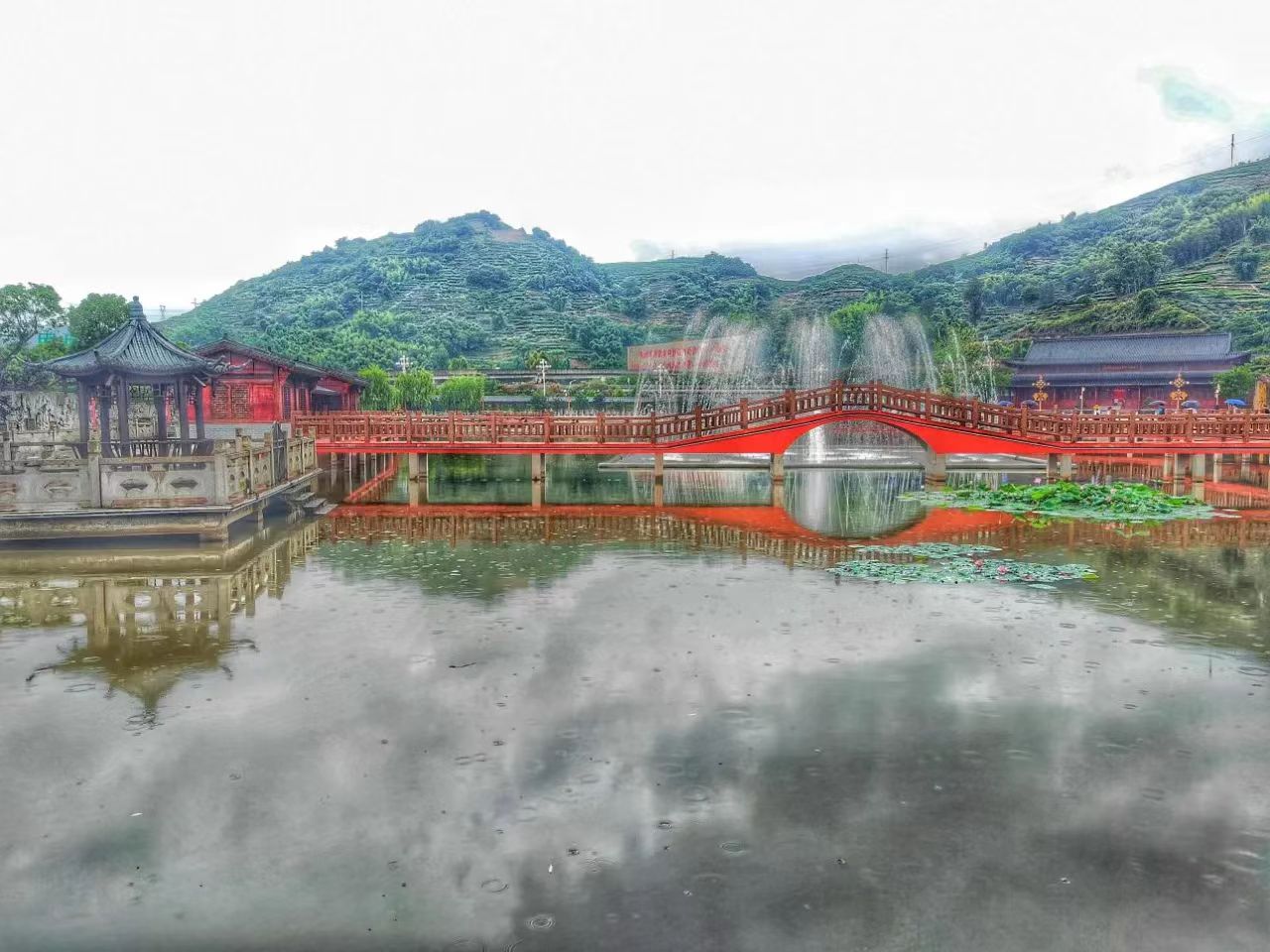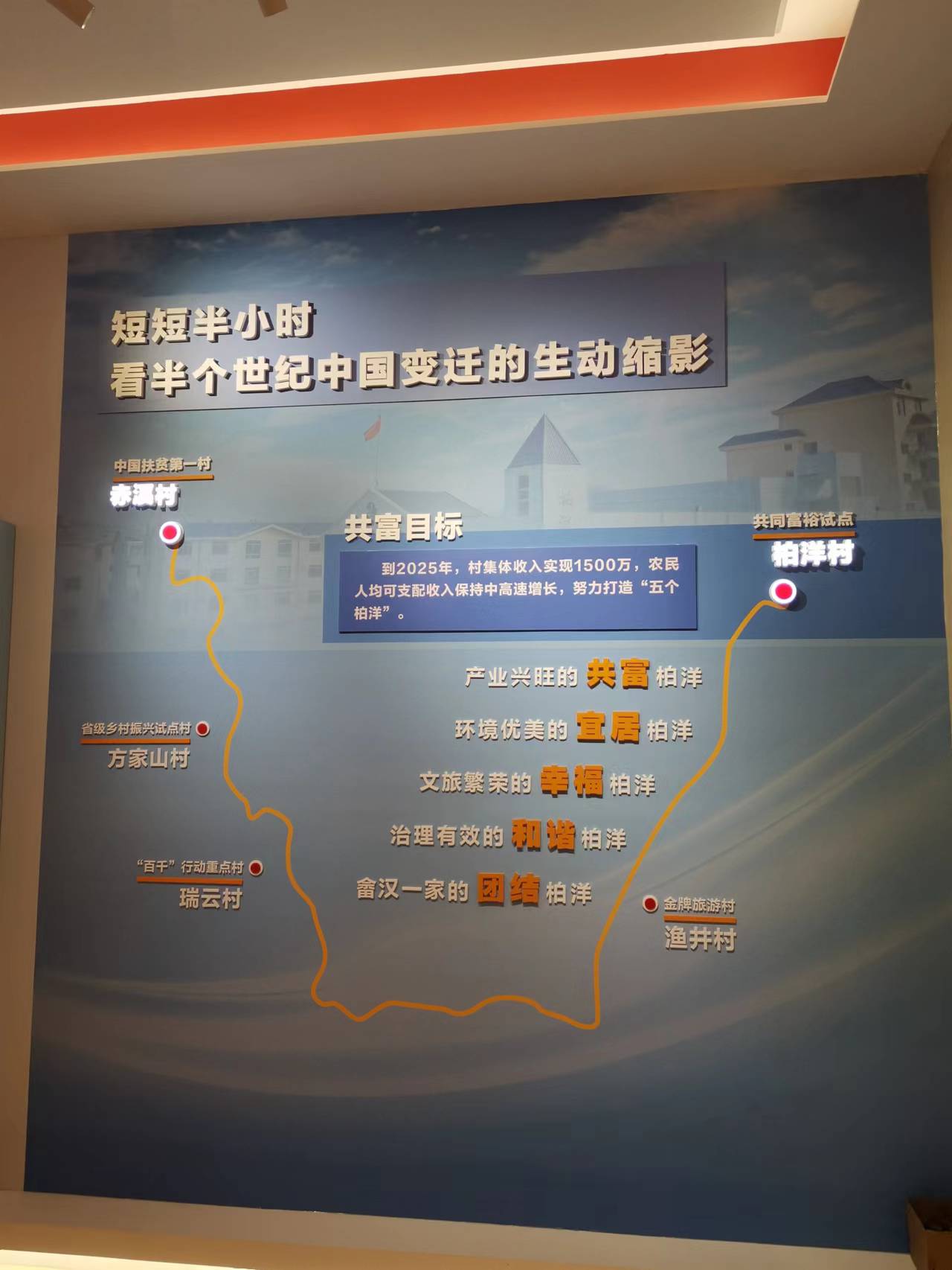 青山如黛,綠水如煙,水榭亭臺倒映湖面,噴泉夏荷相映成輝,細雨中的柏洋村,如詩如畫。在“柏洋促進共同富裕主題展”展館內,展示了這個“全國小康建設明星村”共同富裕的故事。