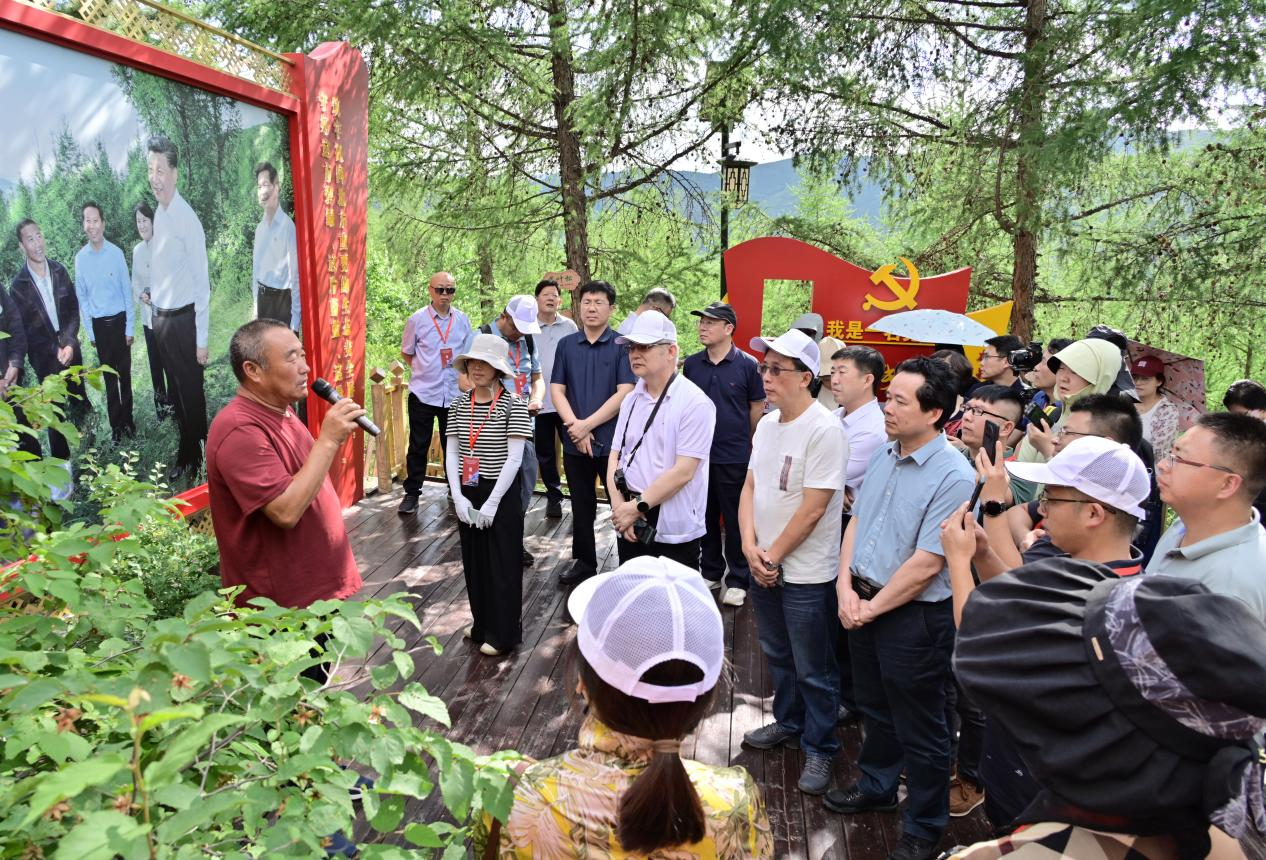 馬鞍山林場(chǎng)副場(chǎng)長柴樹嶺向采訪團(tuán)講述習(xí)近平總書記考察林場(chǎng)時(shí)的情景