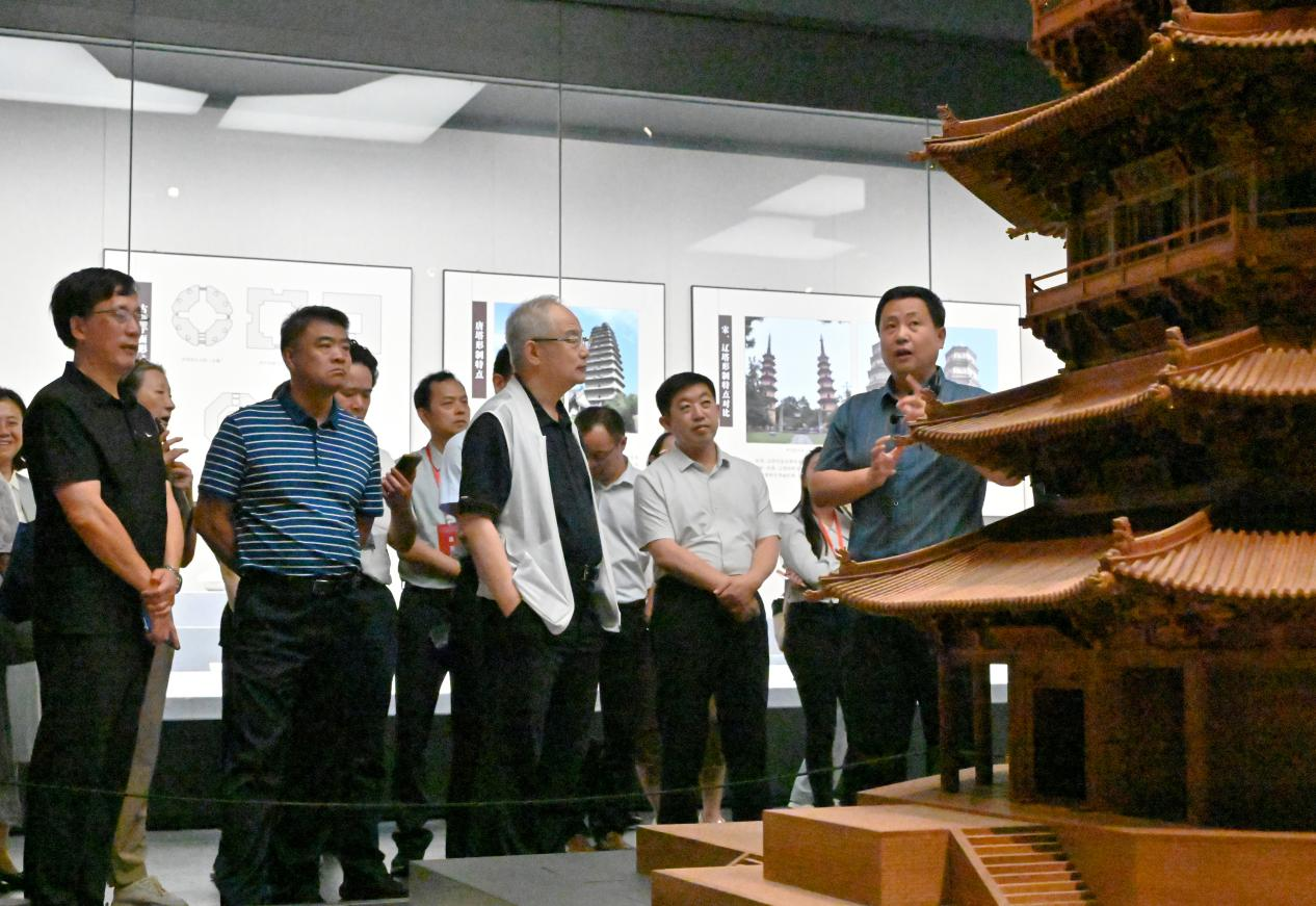 遼代歷史文化博物館館長(zhǎng)黃文博向采訪團(tuán)介紹遼塔建筑藝術(shù)。張耀東/攝